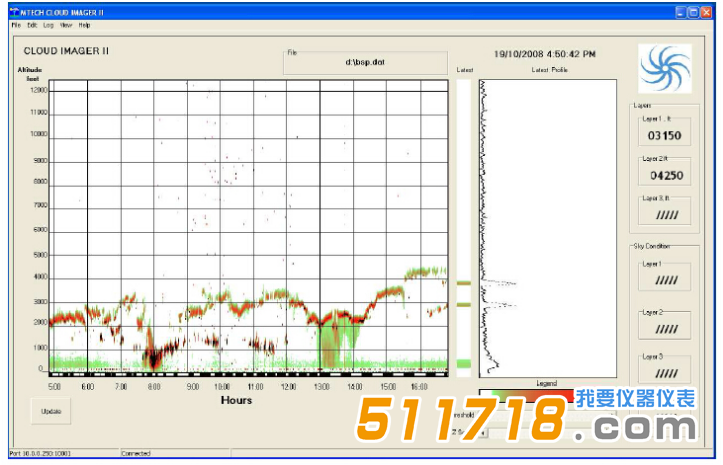 云高儀可提供以太網、RS-232和RS-422等多種標準數據通訊接口。云層探測運算公式內置于儀器組件中。8200-CHS可連接至配有圖形化云層分析軟件的工作站,能夠得到每次掃描返回信號的廓線。內置的RS-232、RS422通訊協議支持本地和遠程的控制、測試和數據讀取。另外,還可以選擇以太網、無線電、微波或DSL Modem等方式。
