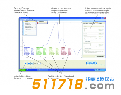 使用CIRS運動控制軟件獨立控制前列腺運動。圖形用戶界面提供無限種類的優(yōu)化運動配置文件,同時將Dynamic Pelvis Phantom的操作簡化到直觀的水平。